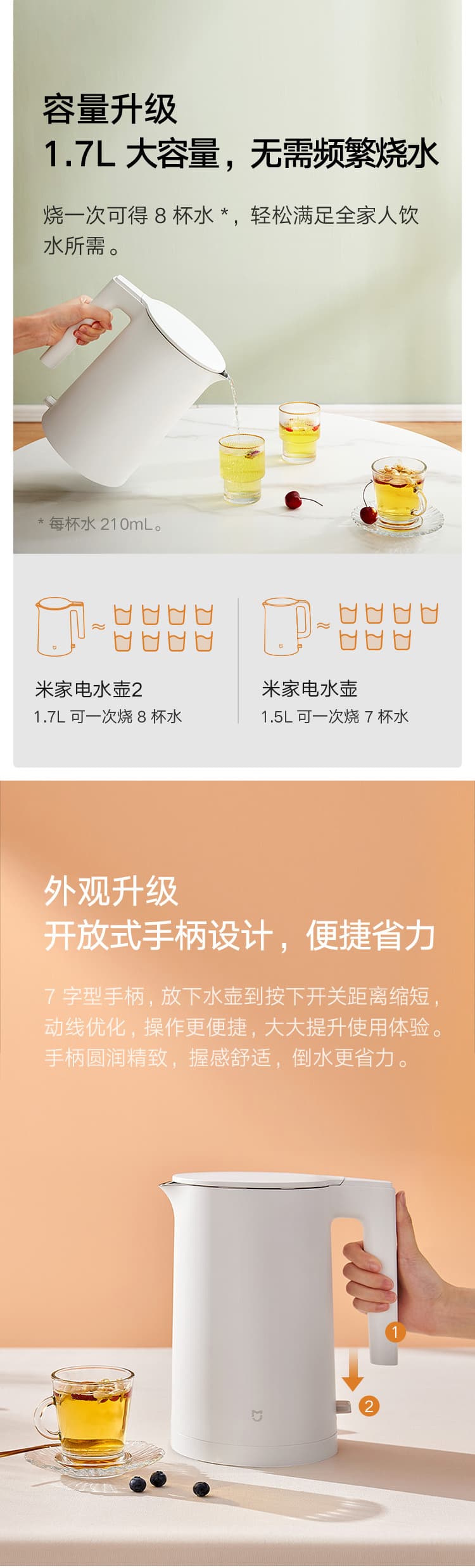 小米米家电水壶2大容量1.7L电热水壶办公家用烧水壶不锈钢官方