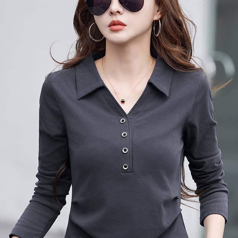 纯棉有领长袖t恤女新款春季洋气宽松翻领收腰上衣打底衫外穿